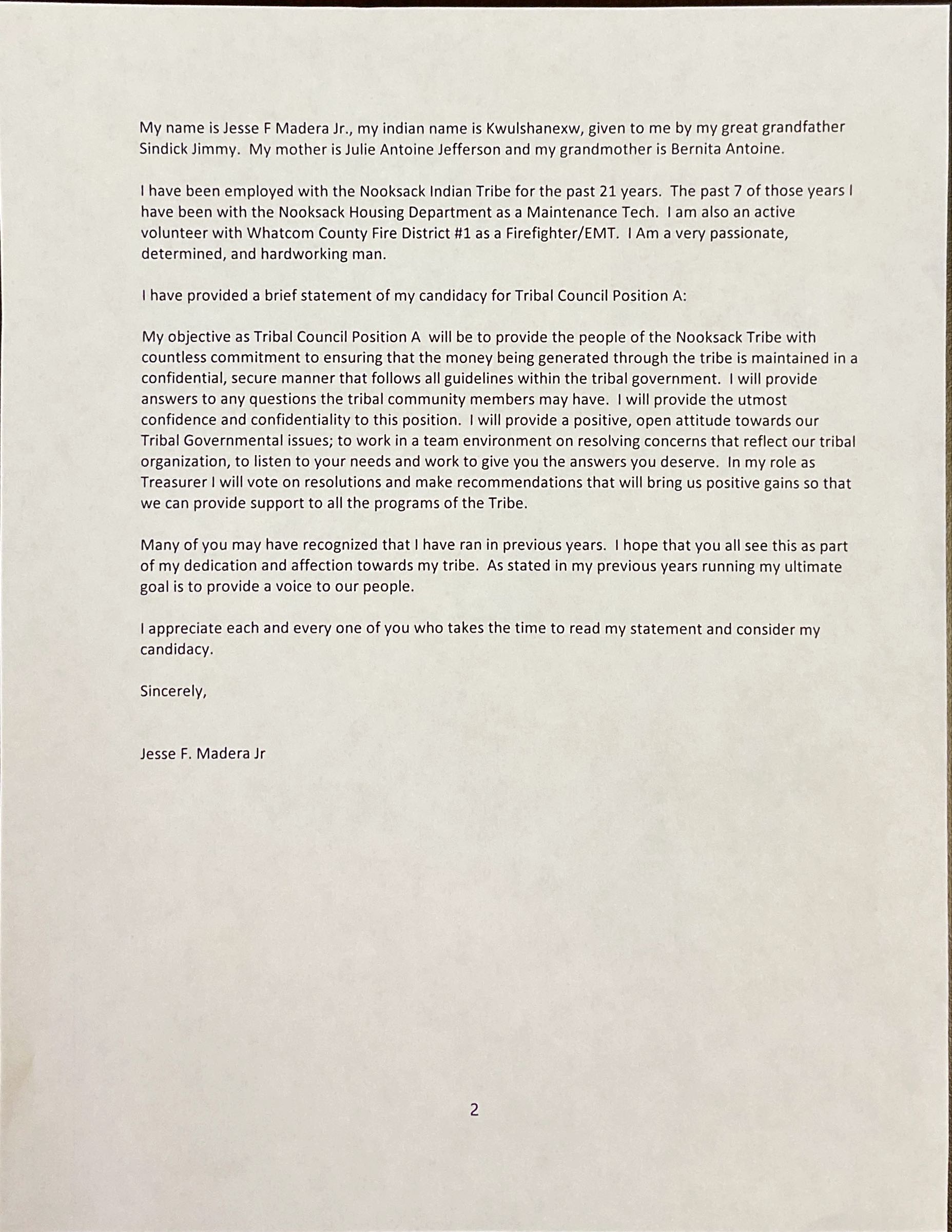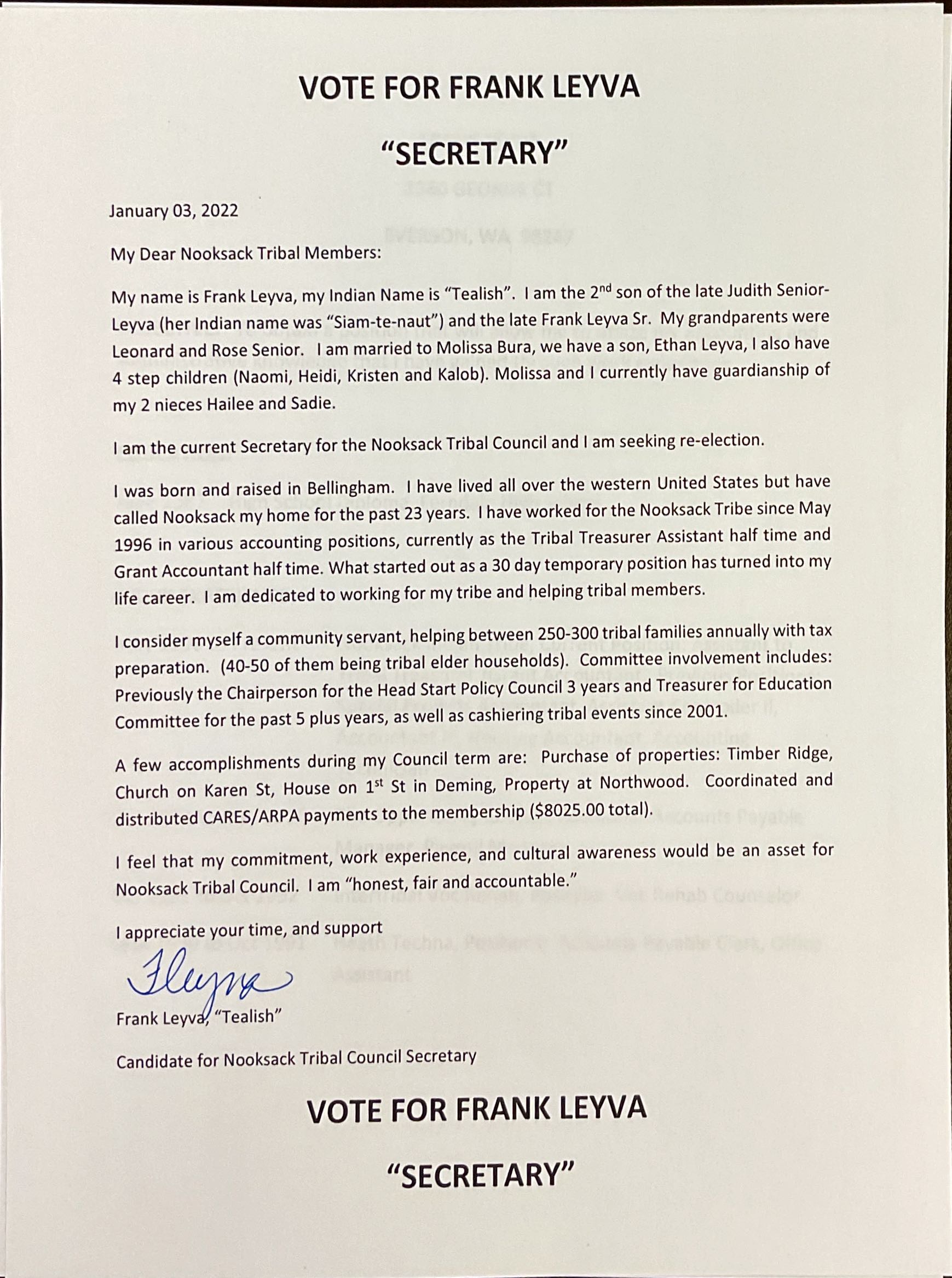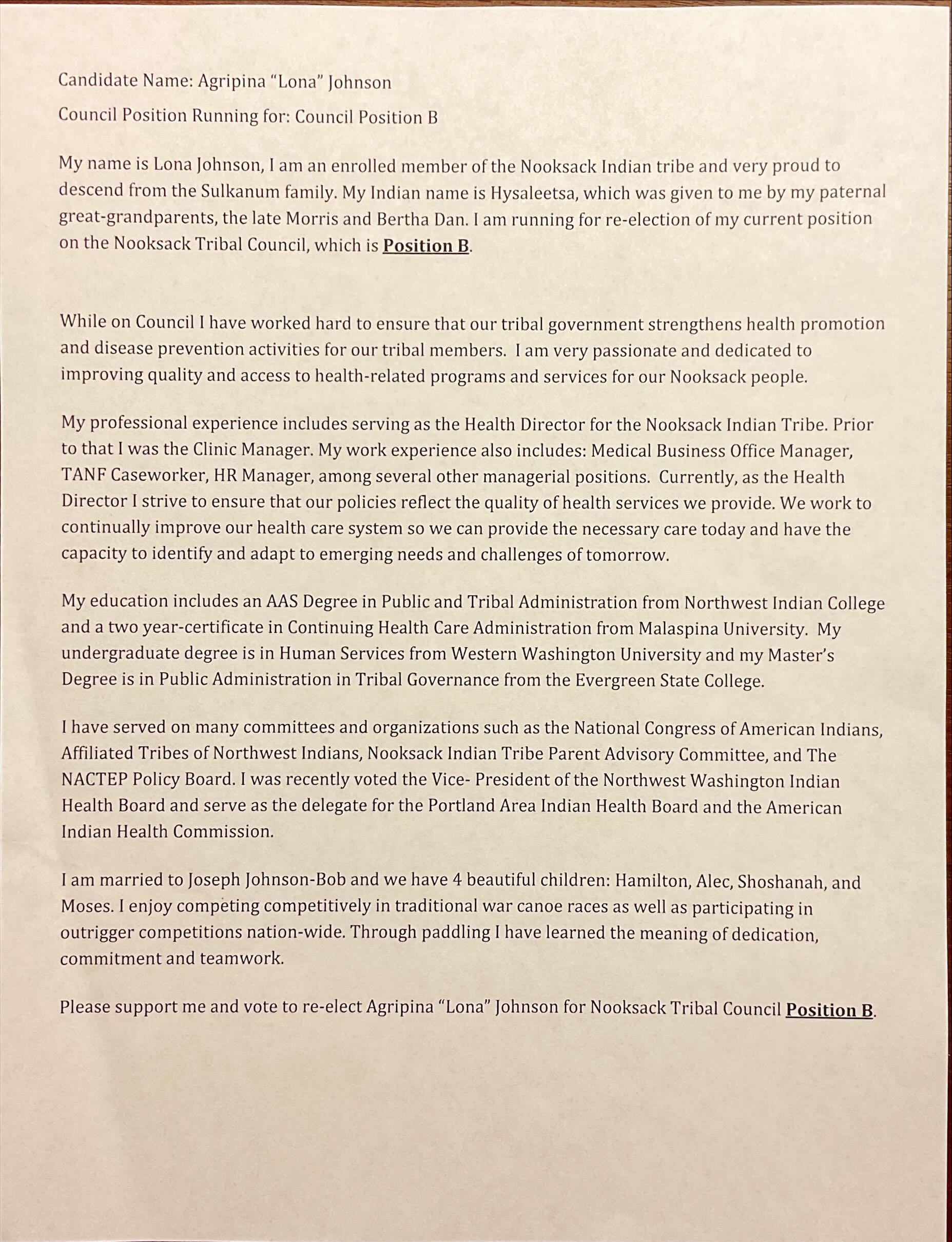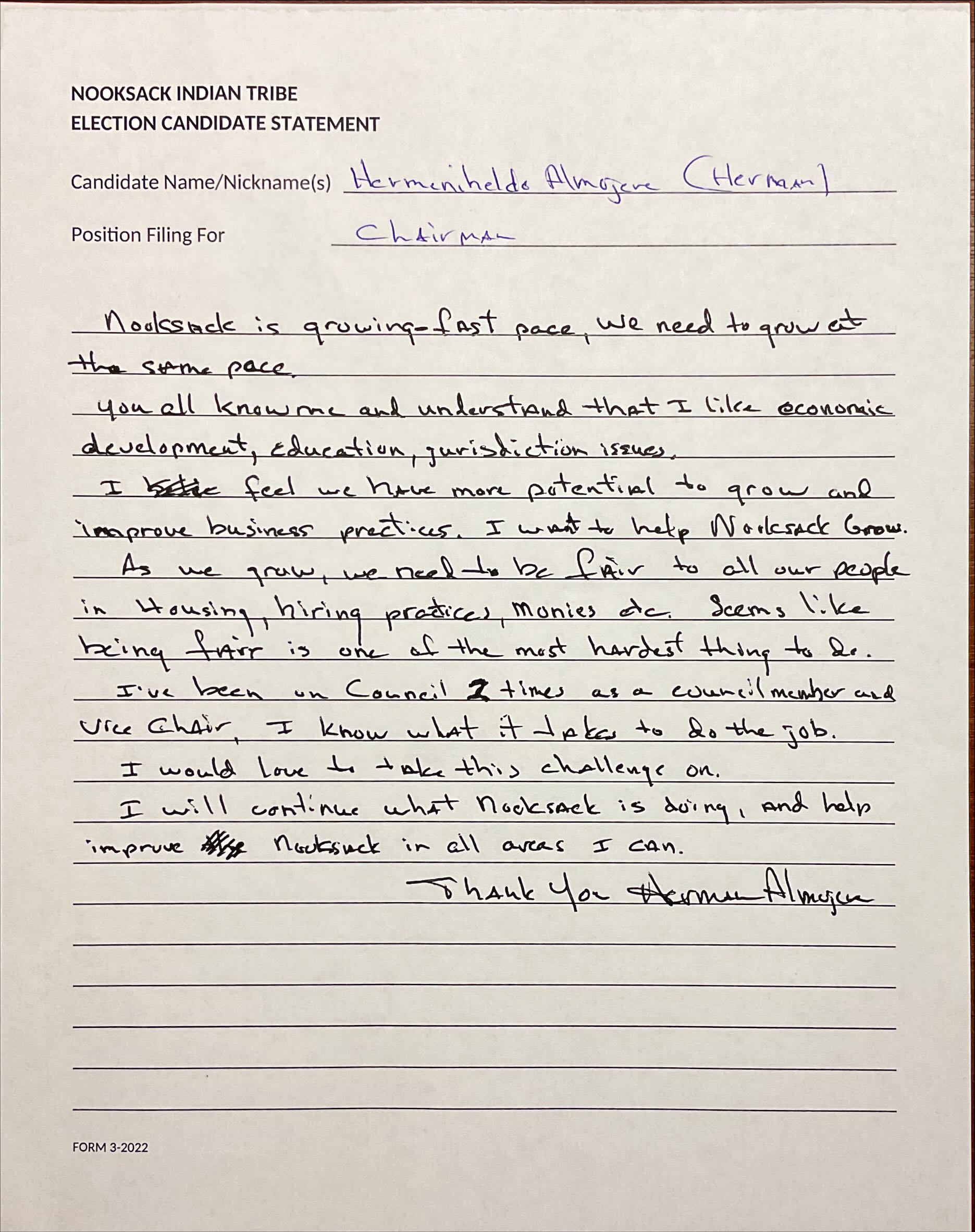 Any eligible voter may vote by Absentee ballot in the Primary and/or the General Elections. Absentee ballots must be requested by the voter from the Election Board. Requests may be made in person at the Election Board office during regular business hours, by telephone at (505) 980-1076 or by mail at Nooksack Election Supervisor, Post Office Box 6306, Albuquerque, New Mexico. 87197, beginning December 27, 2021 and ending January 7, 2022. Regardless of the method used to request an Absentee ballot, the requester, must be able to confirm their membership number, date of birth, and official address as confirmed by the Nooksack Tribal Enrollment Department.