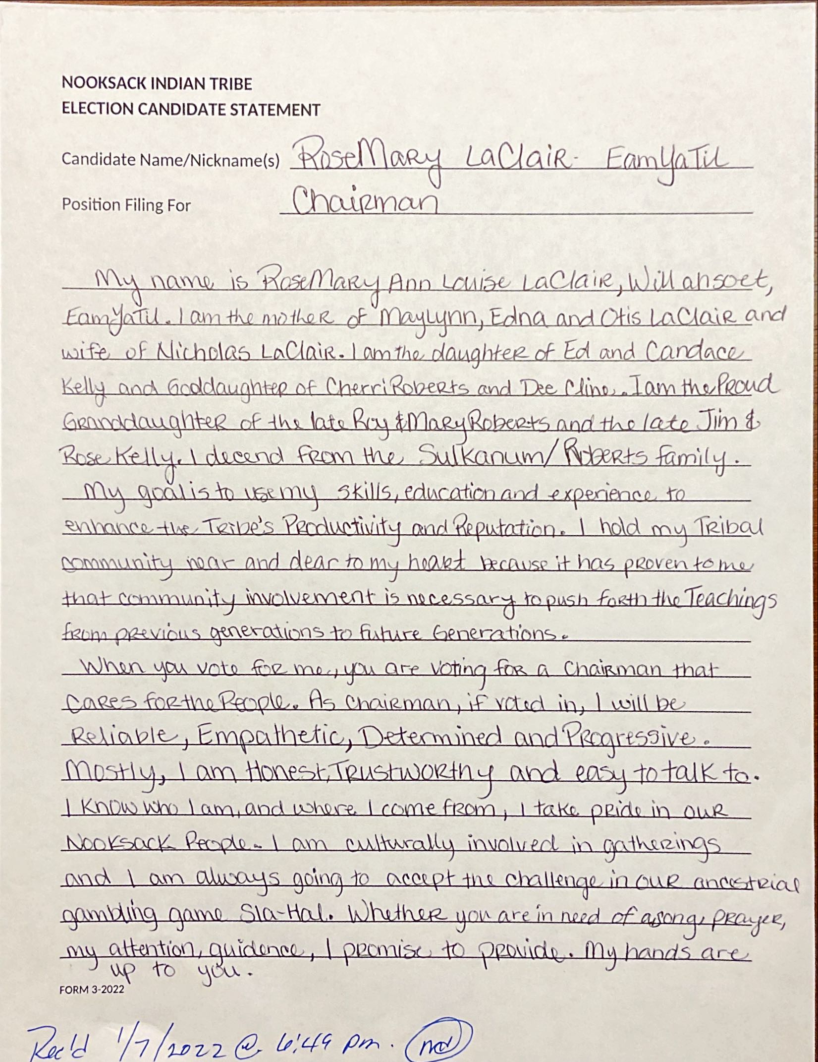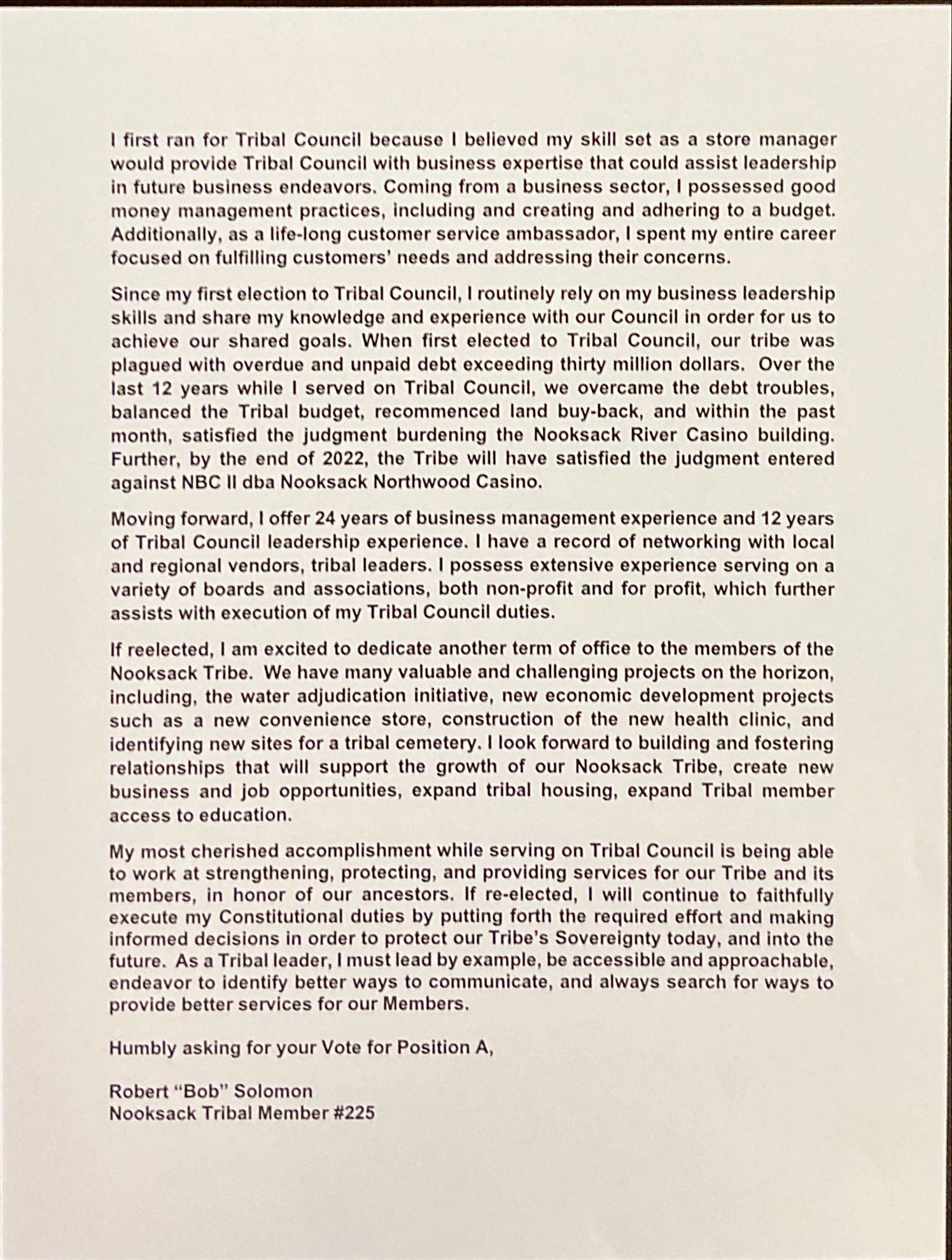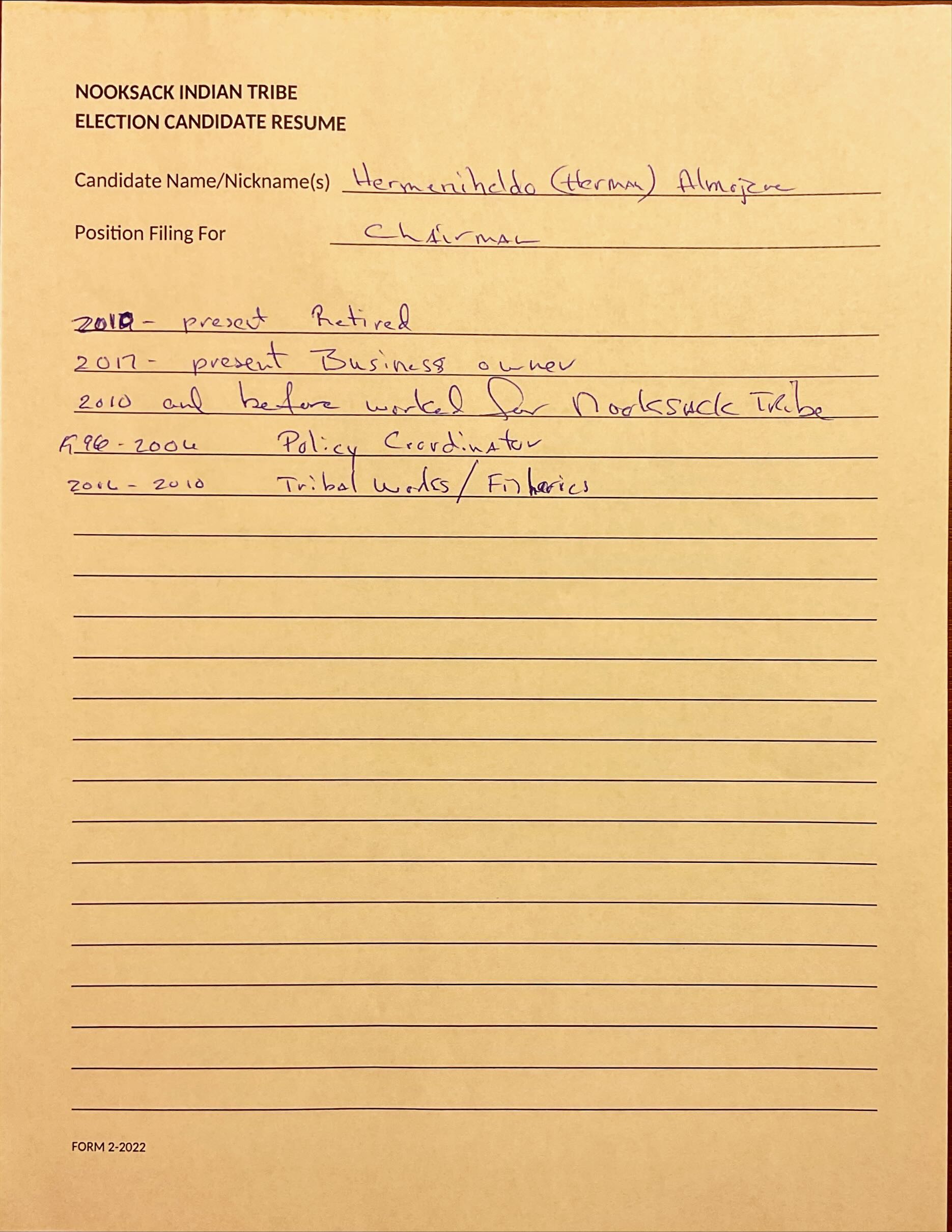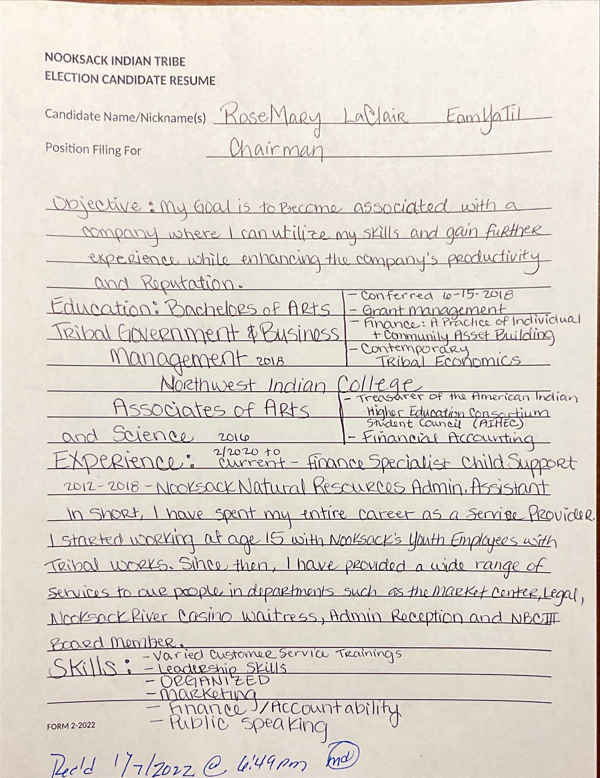 Any eligible voter may vote by Absentee ballot in the Primary and/or the General Elections. Absentee ballots must be requested by the voter from the Election Board. Requests may be made in person at the Election Board office during regular business hours, by telephone at (505) 980-1076 or by mail at Nooksack Election Supervisor, Post Office Box 6306, Albuquerque, New Mexico. 87197, beginning December 27, 2021 and ending January 7, 2022. Regardless of the method used to request an Absentee ballot, the requester, must be able to confirm their membership number, date of birth, and official address as confirmed by the Nooksack Tribal Enrollment Department.