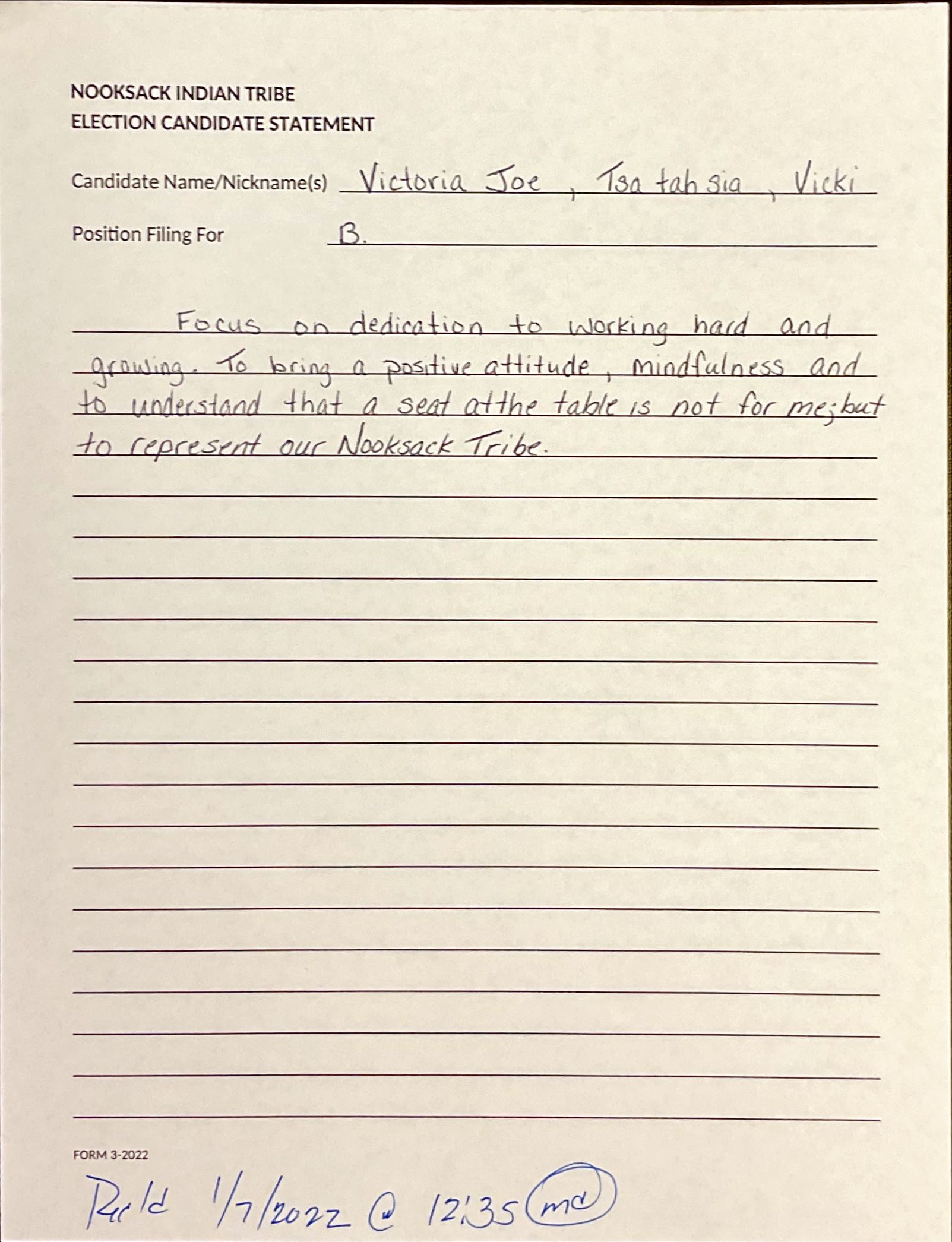TRIBAL ELECTION BOARD OFFICE NOTICE: Although Nooksack governmental offices are limited to essential personnel only, please be advised that the Election Board office will remain open during posted business hours, 9 am to 5 pm, Monday through Friday. Safety precautions are being observed. Masks are required for entry.