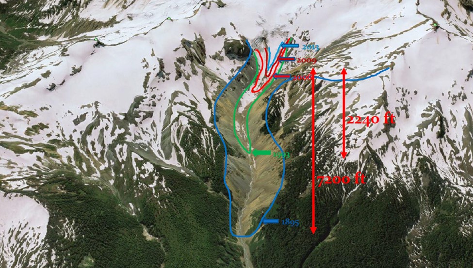 Trends in climate change since the 1900’s in the Pacific Northwest suggest that warming of the climate has occurred and will likely continue to occur, resulting in wetter falls, winters, and springs, but drier summers. More intense rainfall on areas usually covered and protected by snow and glaciers will be more prone to erosion, entrainment, and transport of sediment to streams thereby increasing sediment loads. Glaciers in the Nooksack River watershed that support summer flows have been shown to be receding and losing volume. An analysis of glacier melt contribution to the North Fork during warm periods in August 2015 suggest that as much as 60-95% of the total streamflow was comprised of glacier melt. This emphasizes the importance of glacial melt augmenting flows in the late summer and moderating stream temperatures. Recent studies suggest glaciers have diminished in size today to their smallest extent in the last 4000 years (Pelto 2015). According to Pelto (2015), the mass balance loss in 2015 is the largest of the last 32 years in the North Cascades with losses averaging over three meters water equivalent. There is evidence that the valley glaciers on the north side of Mount Baker have receded an average of 5,000 ft since the maximum extent of glaciers at the end of the Little Ice Age in 1890. Further, these glaciers have receded approximately 1,000 feet just in the last 20 years, with the Mazama Glacier receding over 2,400 feet over that time. These trends transform into changes in the hydrology, thermal regime, and sediment dynamics of the Nooksack River. As glaciers recede, their over-steepened valley walls, primarily consisting of unconsolidated sediment, will be more vulnerable to mass failure, erosion, entrainment, and transport to channels. Increased rain intensity at high elevations will exacerbate this problem by oversaturating soils and causing landslides. Decreased snow accumulation on the glaciers and loss of glacier melt translates to decreased summer flows and higher water temperatures that may approach lethal levels to salmonids.