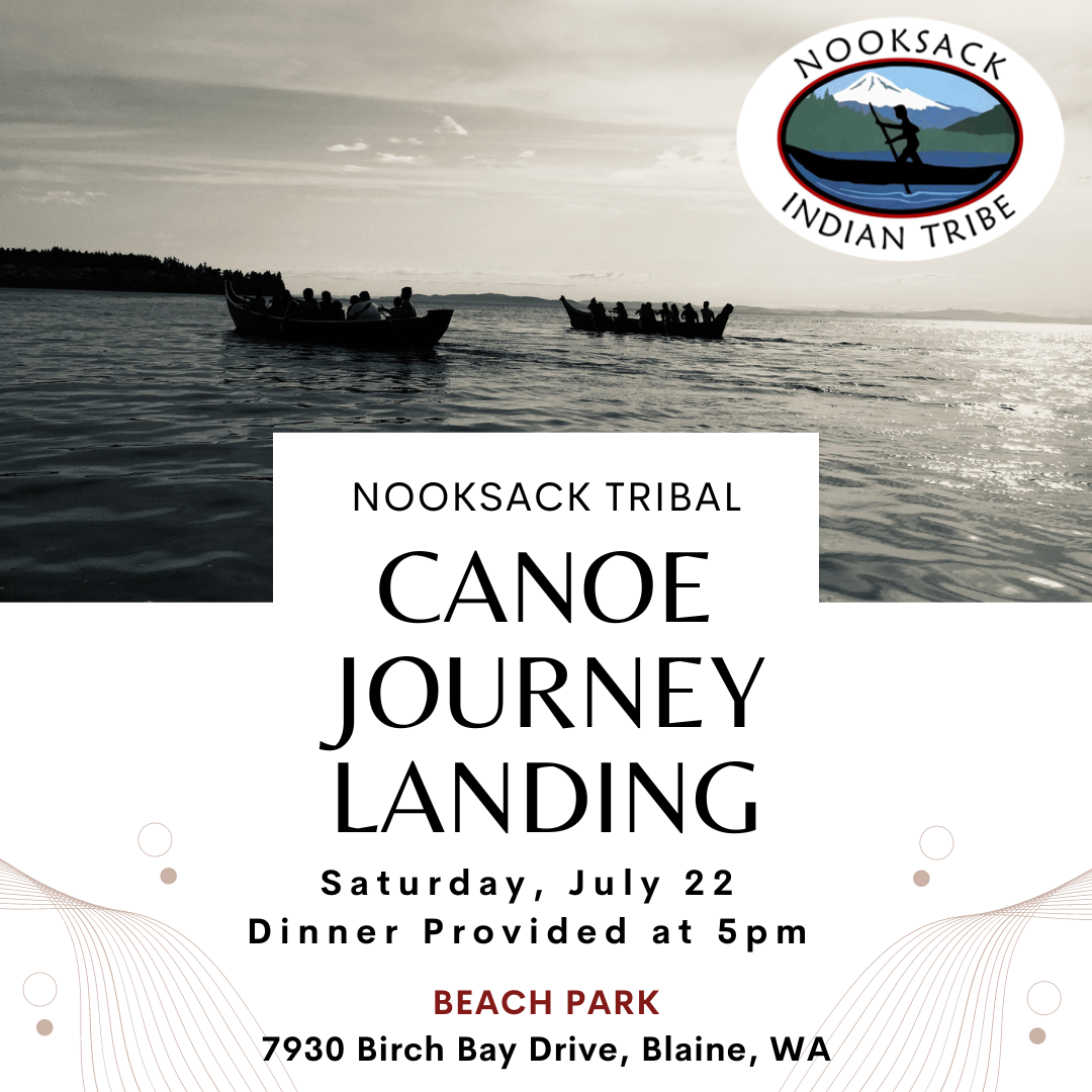 The Nooksack Tribe proudly hosts the Canoe Journey Landing at Beach Park in Birch Bay on Saturday, July 22. Dinner is scheduled to begin at 5pm but is dependent on when canoes arrive. Please note the location is at Beach Park located at 7930 Birch Bay Dr. Blaine WA, NOT Birch Bay State Park.