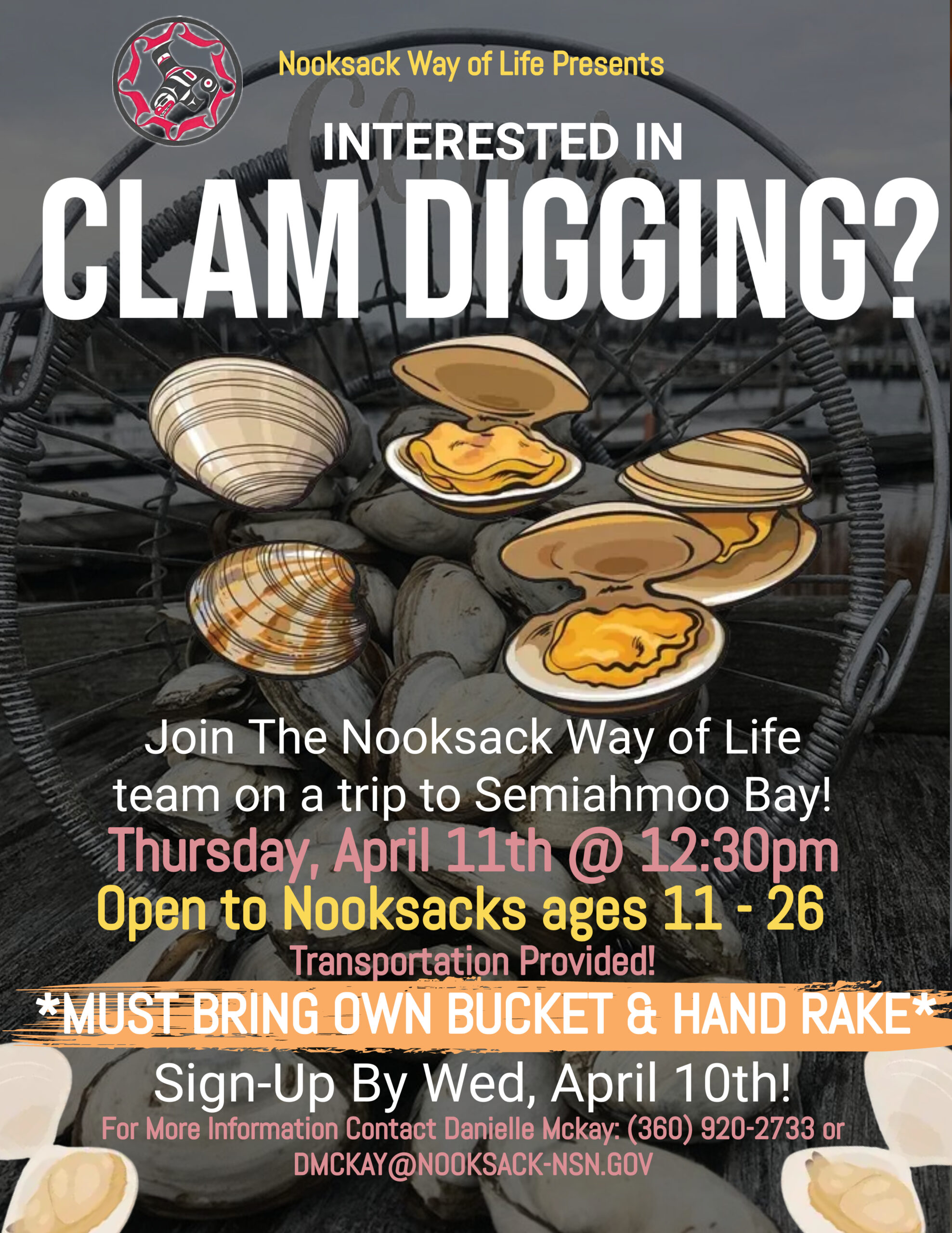 Nooksack Way of Life Program presents Clam Digging at Semiahmoo Bay. 🌊 Open to ages 11-26. Sign up by Wednesday, April 10th if you’re interested in attending Thursday, April 11th at 12:30pm. Transportation provided. For more information or to RSVP, please contact Danielle McKay at 360-920-2733.