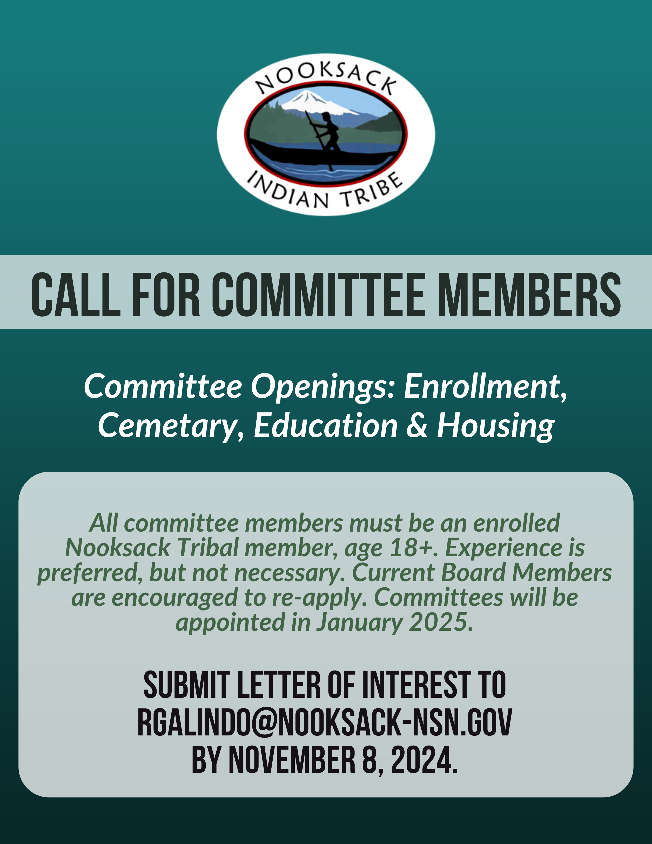 Committee Members are needed. for Enrollment, Cemetary, Education & Housing. Must be a Nooksack Tribal Member and age 18+. Letters of Interest can be submitted to Rebecca Galindo at rgalindo@nooksack-nsn.gov by November 8, 2024. Committees will be appointed January 2025.