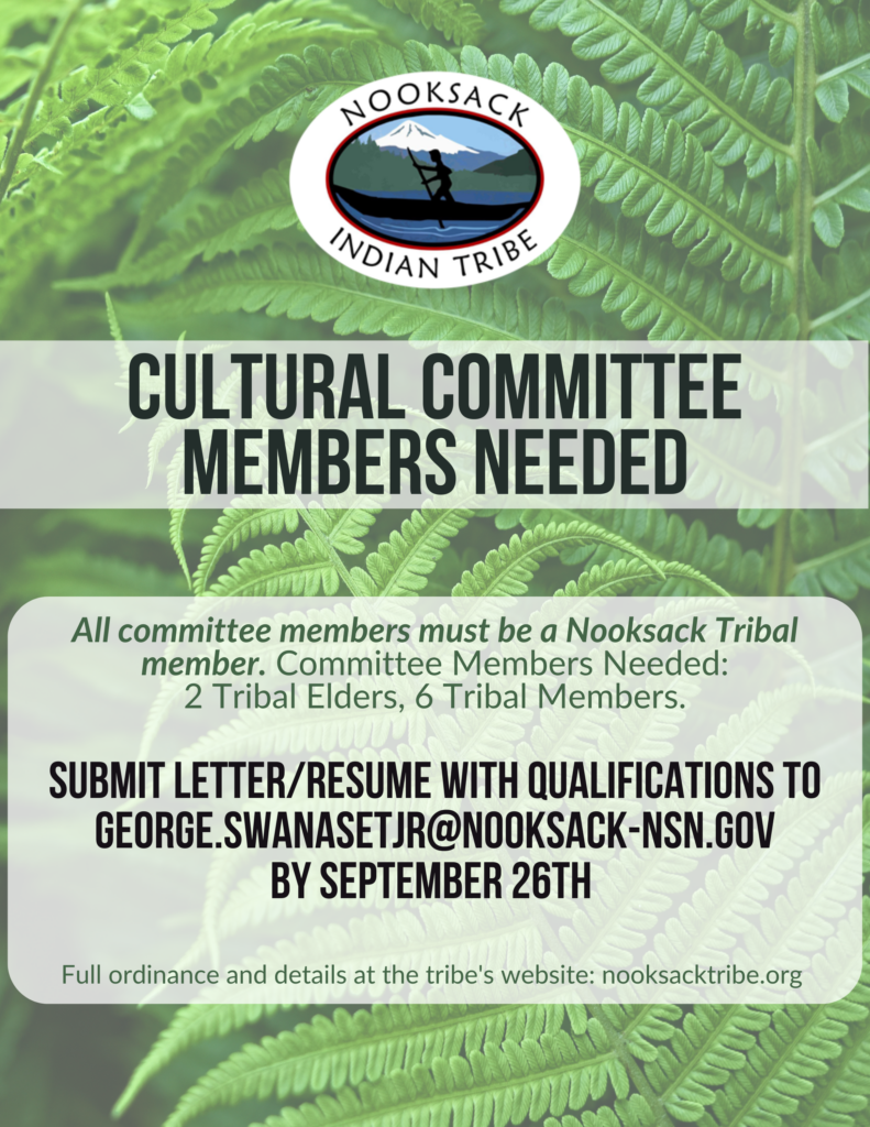 Cultural Committee Members needed! The committee is comprised of 8 Nooksack Tribal Members, including two tribal elders and 6 other Nooksack members. Submit a letter of interest and/or resume to George Swanaset, Jr. at george.swanasetjr@nooksack-nsn.gov by September 26, 2024.