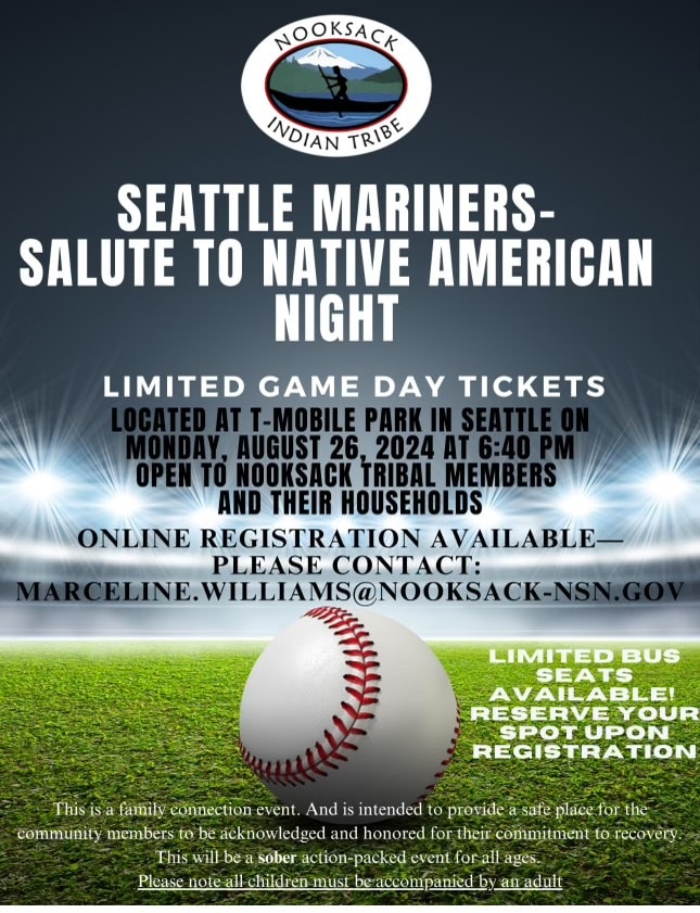Salute to Native American Night is Monday, August 26th at 6:40pm. Limited tickets are now available to Nooksack Tribal Members and their households. Game admission tickets are digital only and require an email to transfer. $10 food cards are available for pick up at the Chemical Dependency Office. If transportation is needed, you must note that at the link. Limited bus seats available.