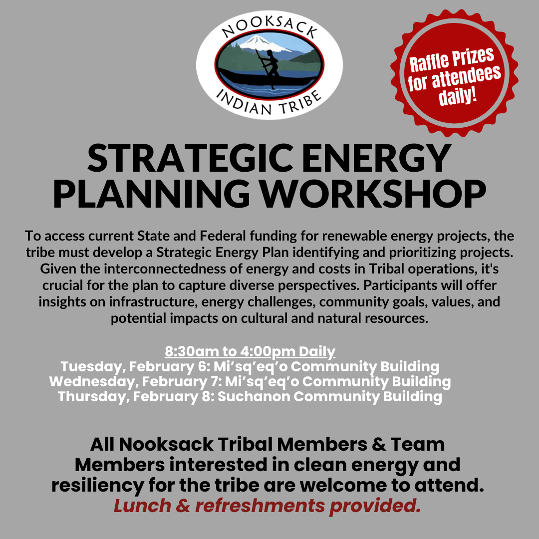 All Nooksack Tribal Members & Team Members interested in clean energy and resiliency for the tribe are welcome to attend. Lunch & refreshments provided.