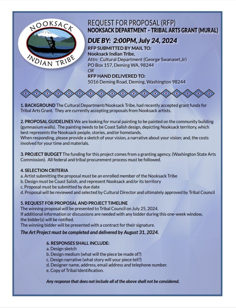 Tribal Arts Grant. They are currently accepting proposals from Nooksack artists. - PROPOSAL GUIDELINES We are looking for mural painting to be painted on the community building