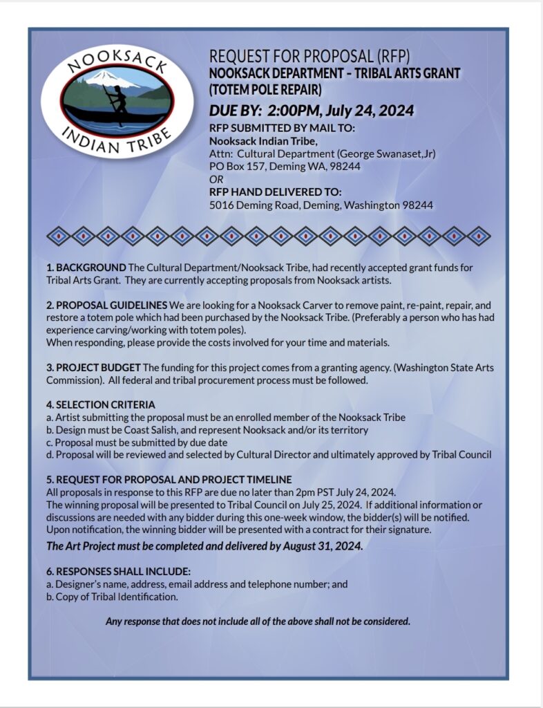 - PROPOSAL GUIDELINES We are looking for a Nooksack Carver to remove paint, re-paint, repair, and restore a totem pole which had been purchased by the Nooksack Tribe. (Preferably a person who has had experience carving/working with totem poles).
