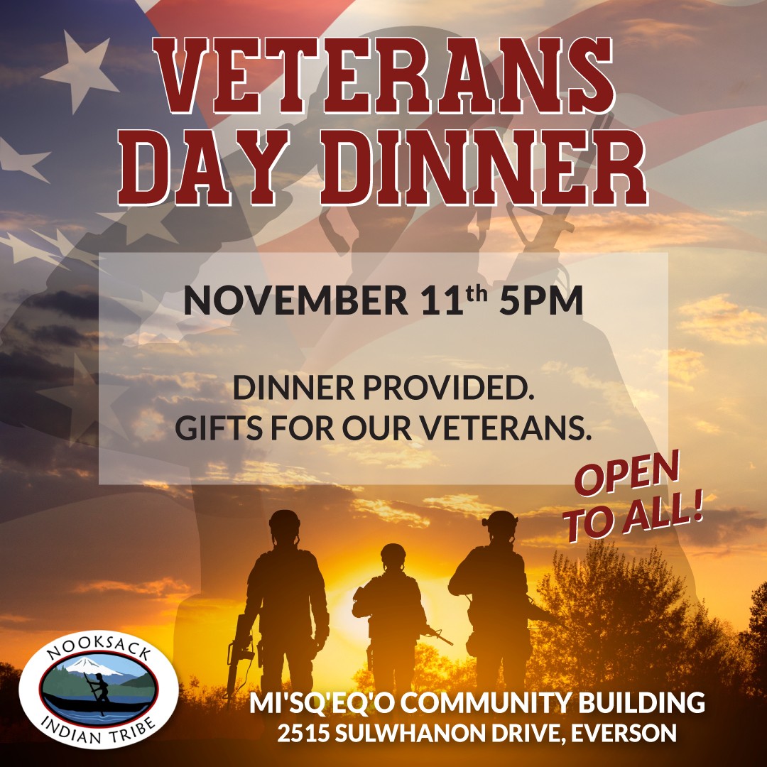 Veterans Day Dinner 11/11/24 at 5pm Posted November 8, 2024By Abby Yates Uncategorized The Nooksack Tribe is proudly hosting a Veterans Day Dinner on Monday, November 11th at 5pm. There will be gifts for our Veterans. This event is open to all. Location: Mi’sq’eq’o Community Building located at 2515 Sulwhanon Drive, Everson.