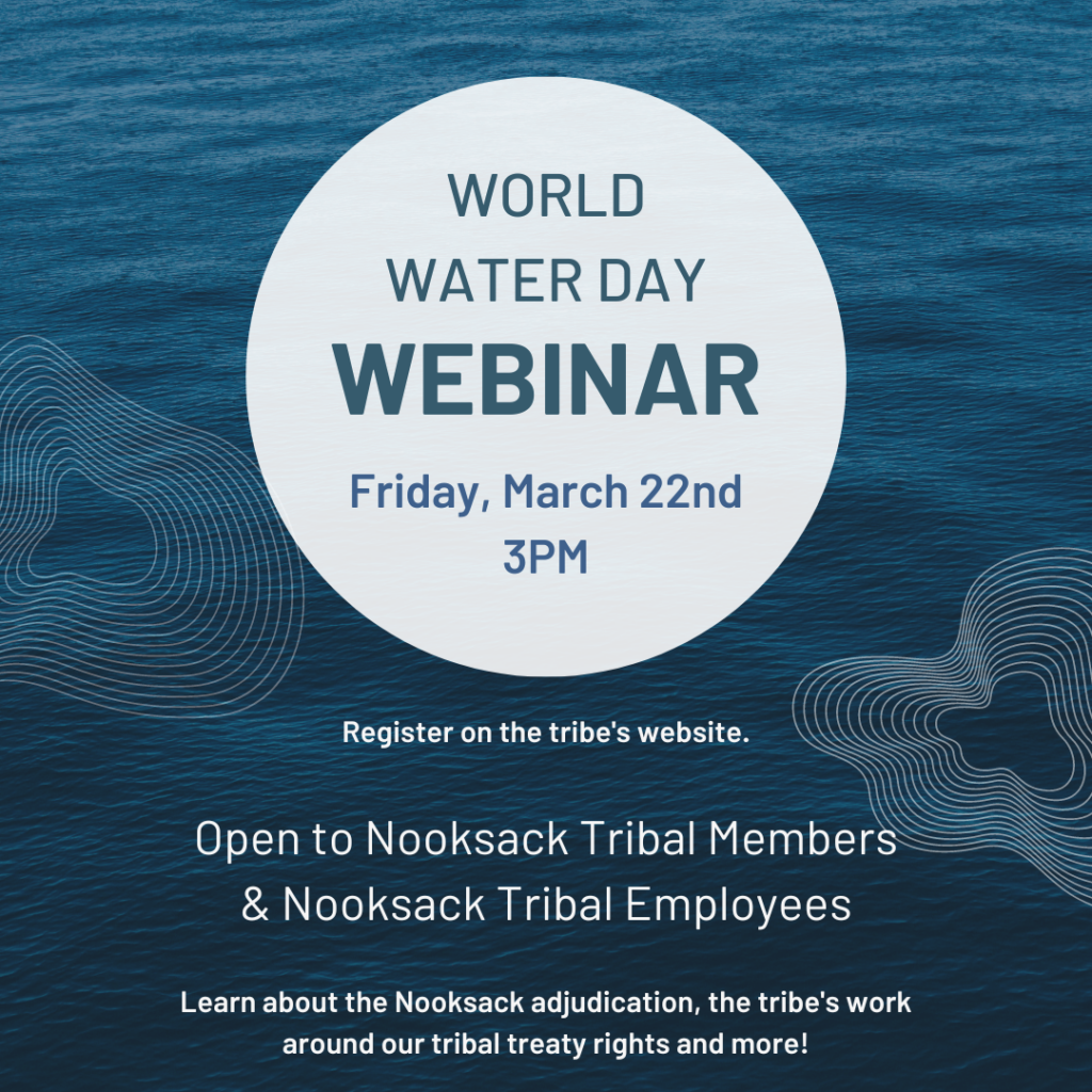 This webinar is to celebrate World Water Day and the important work the Nooksack Tribe is doing around our tribal treaty water rights including the adjudication of the Nooksack River basin, fish barrier removal and additional projects in and around our waterways. This meeting is open to enrolled Nooksack Tribal Members and employees of the Nooksack Tribe.